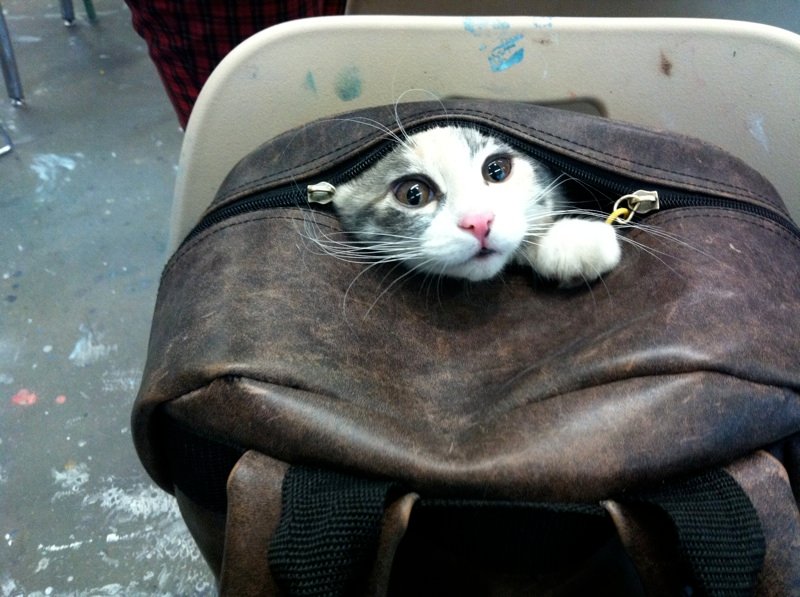In a well-padded backpack, nestled within; a little grey kitten waiting to attack. She waits within the bag for a moment to strike and peek her little head unexpectedly out of the zipper of the leather licensed character bag. Some children will point and tell there mothers of what they saw but the parent will not believe it. This social construct broken; these people with there eyes to the floor or eyes facing forward, eyes within phones; then suddenly, a kittens meow emerges from atop a man’s bag and then there base instinct kicks in and they want to communicate and touch the cute creature. Reestablishing Social Society and creating a new life for others.