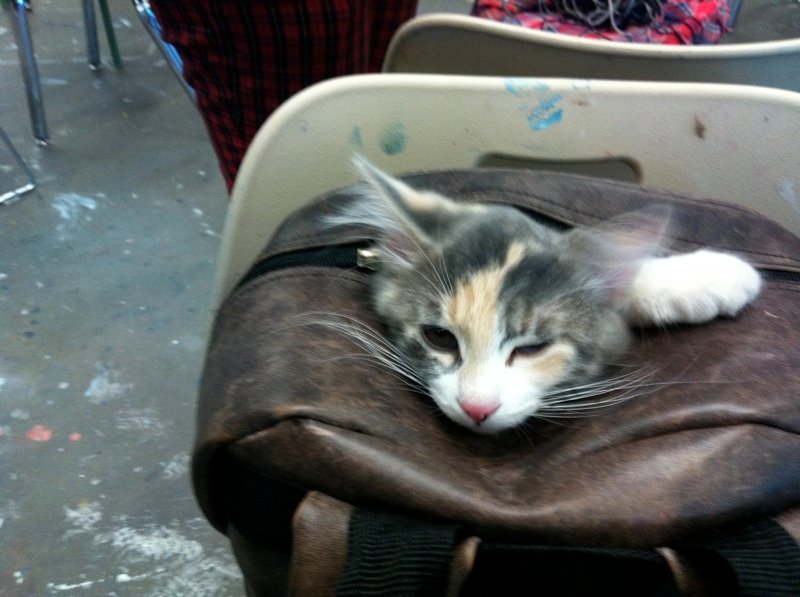 In a well-padded backpack, nestled within; a little grey kitten waiting to attack. She waits within the bag for a moment to strike and peek her little head unexpectedly out of the zipper of the leather licensed character bag. Some children will point and tell there mothers of what they saw but the parent will not believe it. This social construct broken; these people with there eyes to the floor or eyes facing forward, eyes within phones; then suddenly, a kittens meow emerges from atop a man’s bag and then there base instinct kicks in and they want to communicate and touch the cute creature. Reestablishing Social Society and creating a new life for others.