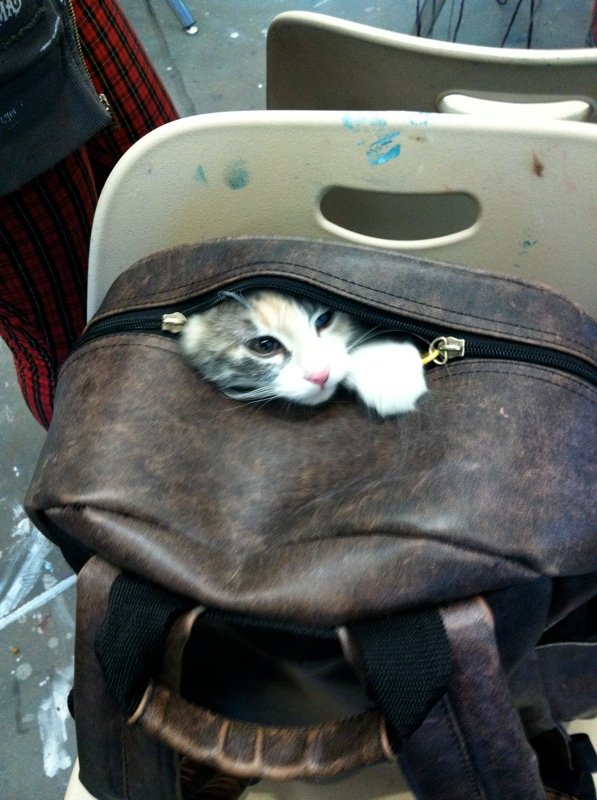 In a well-padded backpack, nestled within; a little grey kitten waiting to attack. She waits within the bag for a moment to strike and peek her little head unexpectedly out of the zipper of the leather licensed character bag. Some children will point and tell there mothers of what they saw but the parent will not believe it. This social construct broken; these people with there eyes to the floor or eyes facing forward, eyes within phones; then suddenly, a kittens meow emerges from atop a man’s bag and then there base instinct kicks in and they want to communicate and touch the cute creature. Reestablishing Social Society and creating a new life for others.