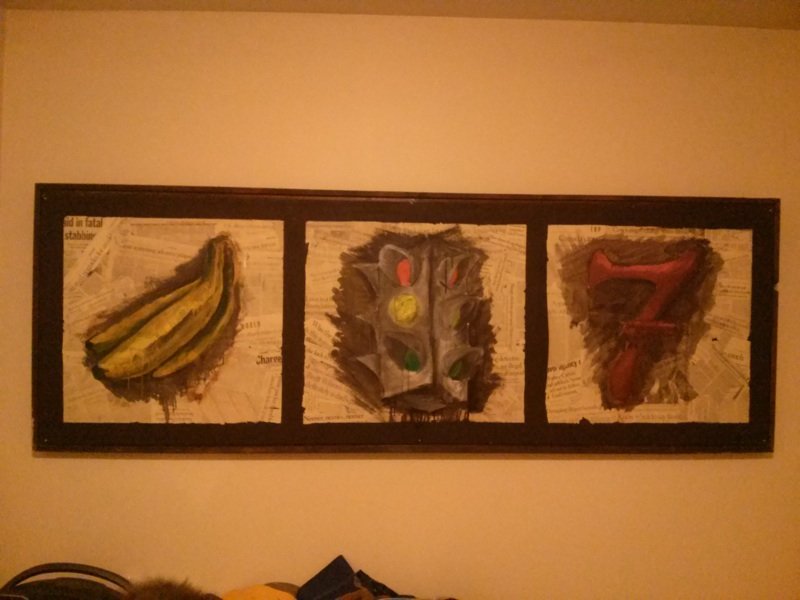 Bananas, Traffic lights and the Number 7. The background riddled with newpaper articles telling us about the strange, grotesque and violent. What could it mean?