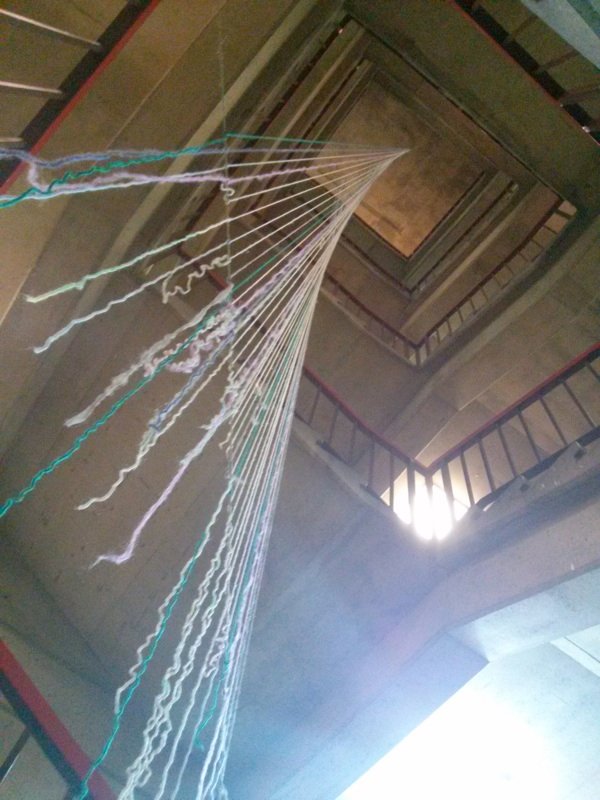 stretched lengths of yarn from the 5th floor all the way to the 1st; creating a silent harp that can only be seen but never heard.