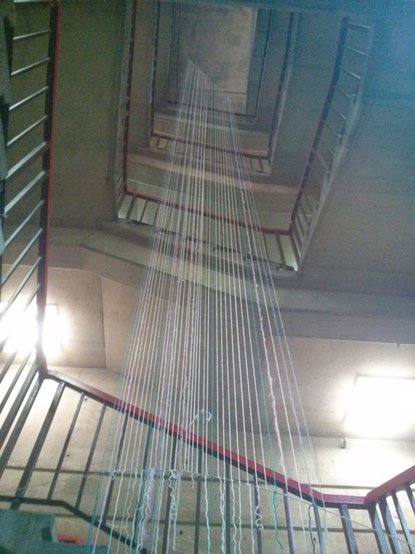 stretched lengths of yarn from the 5th floor all the way to the 1st; creating a silent harp that can only be seen but never heard.