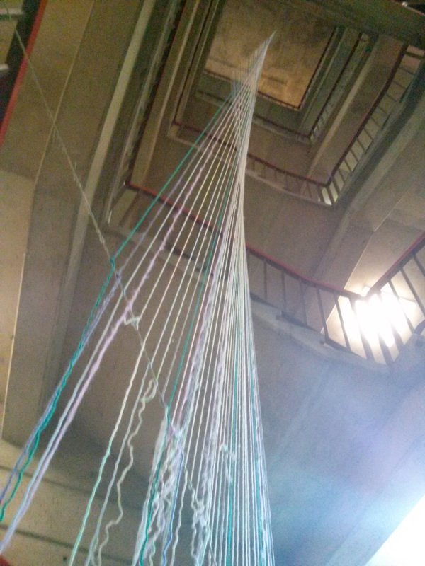 stretched lengths of yarn from the 5th floor all the way to the 1st; creating a silent harp that can only be seen but never heard.