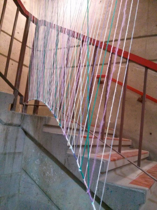 stretched lengths of yarn from the 5th floor all the way to the 1st; creating a silent harp that can only be seen but never heard.