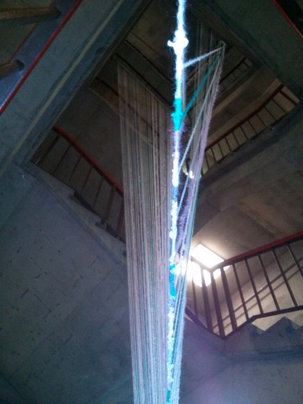 stretched lengths of yarn from the 5th floor all the way to the 1st; creating a silent harp that can only be seen but never heard.
